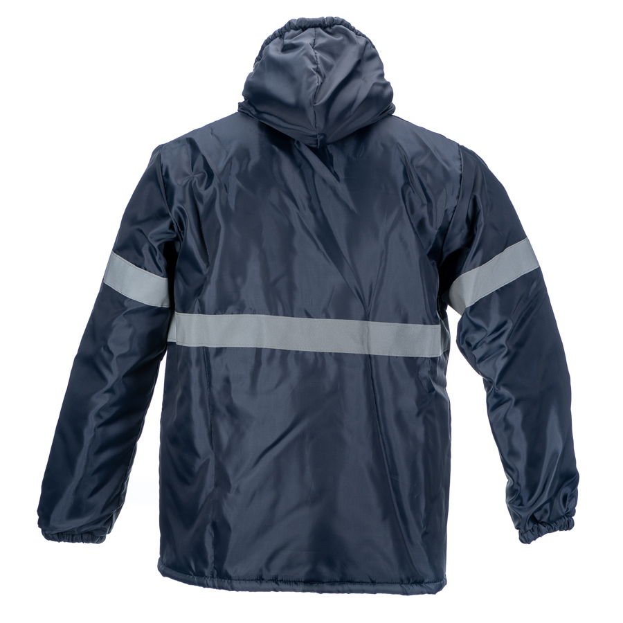 NAVY DOUBLE INSULATED FREEZER JACKET – wind resist, water resist 800-1000mm, insulated -20C Hood with Velcro neck strap for closing in colder conditions Stud fastening storm front with concealed Vislon zip Tunnel waist with drawcord Inner cellphone pocket Left chest pocket with stud flap Lower slash pockets Ribbed cuffs Zip access for embroidery Pockets attached with double needle Stress points bar-tacked F300C Oxford Polyester ∙ Brushed Cotton Flannel Quilted LiningLess